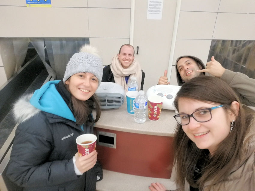 יצאנו החוצה, מקווים למצוא מקום לשבת בו ולהתחמם קצת. מסתבר שגם שם לא חזקים בספספלים. או בחימום. מהר מאוד הבנו שאם אנחנו רוצים לשבת, יש רק מקום אחד, והוא הדלפקים של הצ’ק אין שהיו כבר סגורים בשעה הזו. אז לאט לאט התחילה השתלטות על האזור. המשכנו לחכות, ולשמוע בלופים את ההסבר שמשום שהטיסה שלנו לא היתה אמורה לנחות שם, הם קיבלו הוראה לטפל בכל הטיסות שמשובצות בלו”ז לפני שיטפלו בנו. הבנו שיש לנו עוד לא מעט זמן שם, אז התחלנו להרגיש כמו בבית. מצאנו מפזרי חום שהעובדים הביאו כדי להתחמם והקפנו את עצמנו בהם בניסיון להתחמם. וכמובן שכדי להתנחם, פתחנו את קופסת העוגיות.